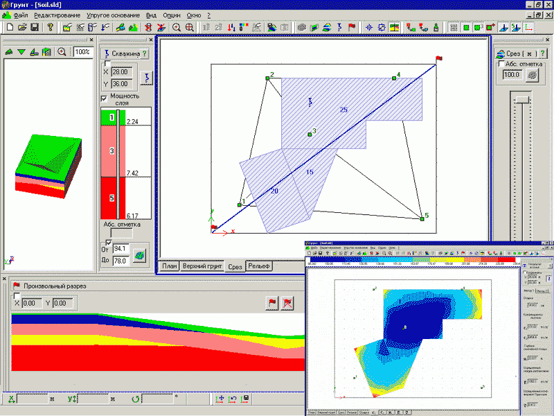 • to compute fields of soil settlements and rigidity of elastic foundation under compression and shear according to different criteria;